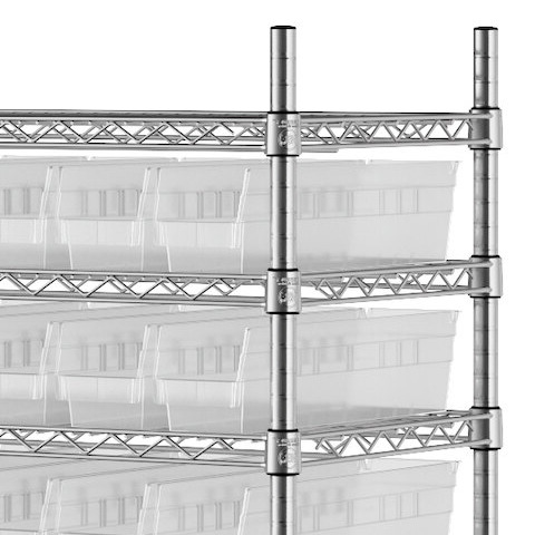 The NSF shelving unit is made of a durable, chrome-plated metal with a clear epoxy coating. It includes 12 shelves, 4 posts, and 118 clear injection-molded polypropylene bins, all of which are made to commercial-grade specifications to withstand industrial conditions and for your business's long-lasting use. Each shelf can hold up to an impressive 450 lb. of evenly distributed weight.