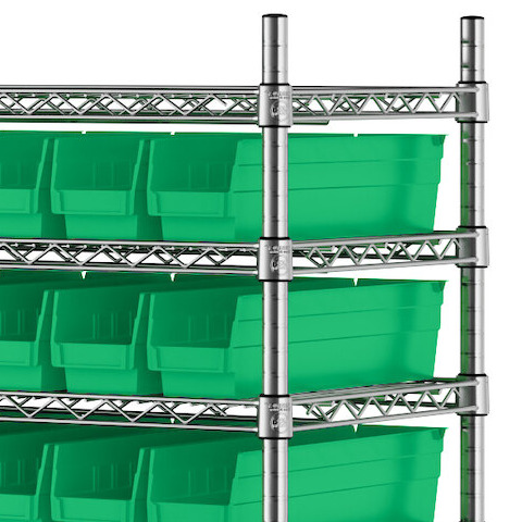 The NSF shelving unit is made of a durable, chrome-plated metal with a clear epoxy coating. It includes 12 shelves, 4 posts, and 118 green injection-molded polypropylene bins, all of which are made to commercial-grade specifications to withstand industrial conditions and for your business's long-lasting use. Each shelf can hold up to an impressive 450 lb. of evenly distributed weight.