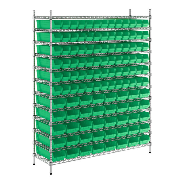 View All ItemsMaintain an organized industrial space with this Regency 18" x 60" x 74" wire shelving unit with 118 green bins.
