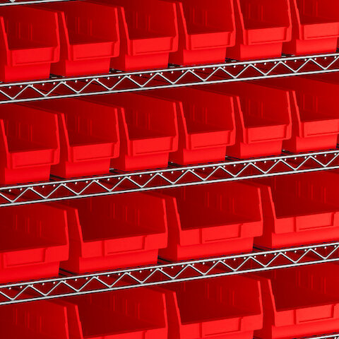 - Includes 12 shelves, 4 posts, and 118 red polypropylene bins