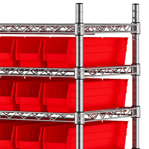 The NSF shelving unit is made of a durable, chrome-plated metal with a clear epoxy coating. It includes 12 shelves, 4 posts, and 118 red injection-molded polypropylene bins, all of which are made to commercial grade specifications to withstand industrial conditions and for your business's long-lasting use. Each shelf can hold up to an impressive 450 lb. of evenly distributed weight.