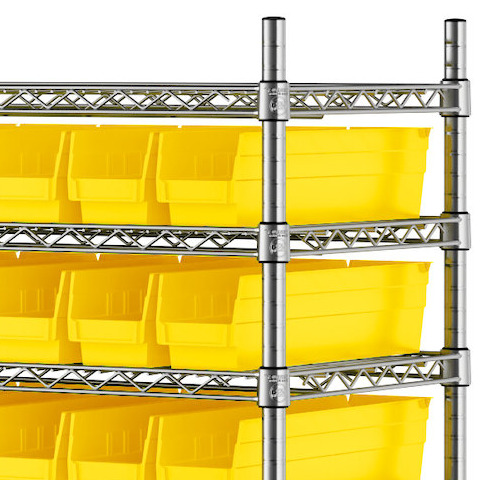 The NSF shelving unit is made of a durable, chrome-plated metal with a clear epoxy coating. It includes 12 shelves, 4 posts, and 118 yellow injection-molded polypropylene bins, all of which are made to commercial-grade specifications to withstand industrial conditions and for your business's long-lasting use. Each shelf can hold up to an impressive 450 lb. of evenly distributed weight.