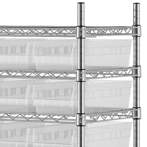 The NSF shelving unit is made of a durable, chrome-plated metal with a clear epoxy coating. It includes 12 shelves, 4 posts, and 88 clear injection-molded polypropylene bins, all of which are made to commercial-grade specifications to withstand industrial conditions and for your business's long-lasting use. Each shelf can hold up to an impressive 450 lb. of evenly distributed weight.