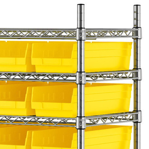 The NSF shelving unit is made of a durable, chrome-plated metal with a clear epoxy coating. It includes 12 shelves, 4 posts, and 88 yellow injection-molded polypropylene bins, all of which are made to commercial-grade specifications to withstand industrial conditions and for your business's long-lasting use. Each shelf can hold up to an impressive 450 lb. of evenly distributed weight.