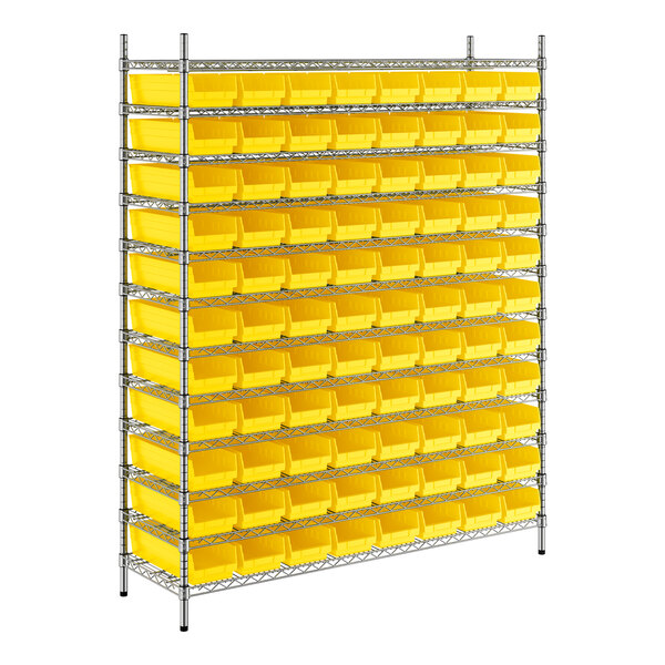 View All ItemsMaintain an organized industrial space with this Regency 18" x 60" x 74" wire shelving unit with 88 yellow bins.