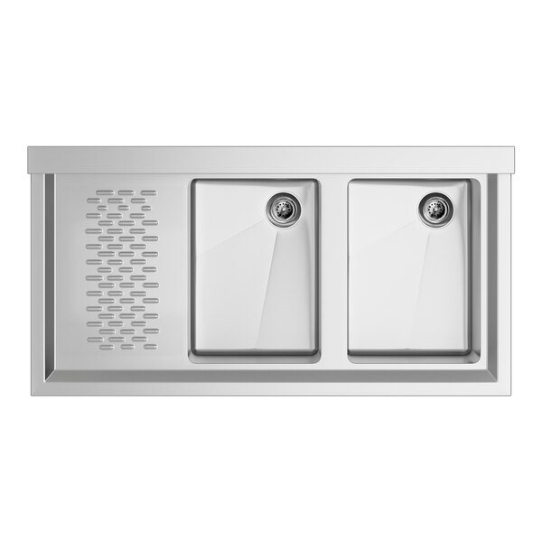 This two-bowl under bar sink with drains comes standard with one 13" drainboard for efficient washing and drying of your barware. It features two precut 4" centers.