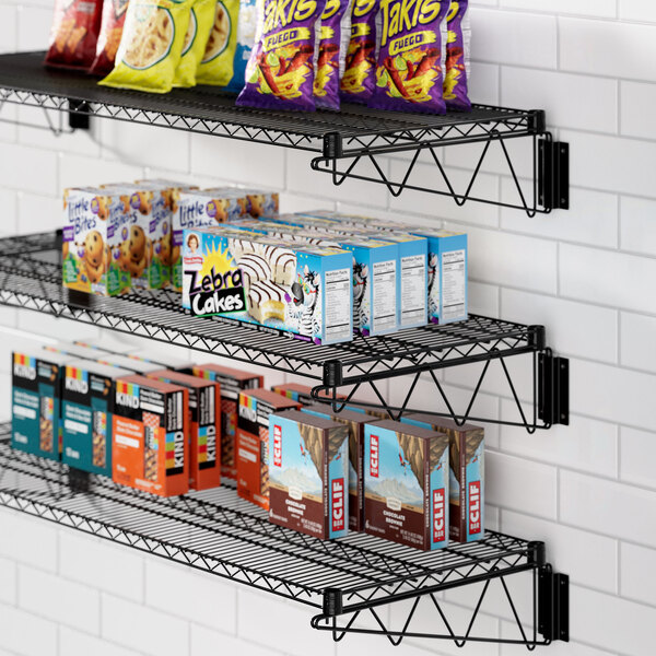 This Regency wall-mount black epoxy wire shelf provides convenience, durability, and space-efficient storage.