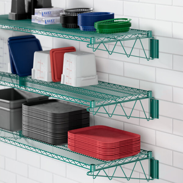 For reliable and convenient wall-mount storage, this Regency wire shelf is an excellent choice! Perfect for a variety of commercial applications, it features a green epoxy coating, making it suitable for dry, moist, or humid environments.