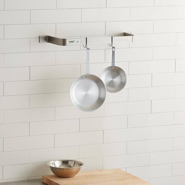 The Regency 24” wall-mounted commercial stainless steel pot rack offers a simple, space-efficient storage solution for your commercial kitchen. Included with your purchase are 2 pot hooks, allowing you to configure your rack to fit your needs. Since this rack is designed to attach directly to your walls, it’s perfect for placement over work tables, food prep areas, or sinks.