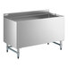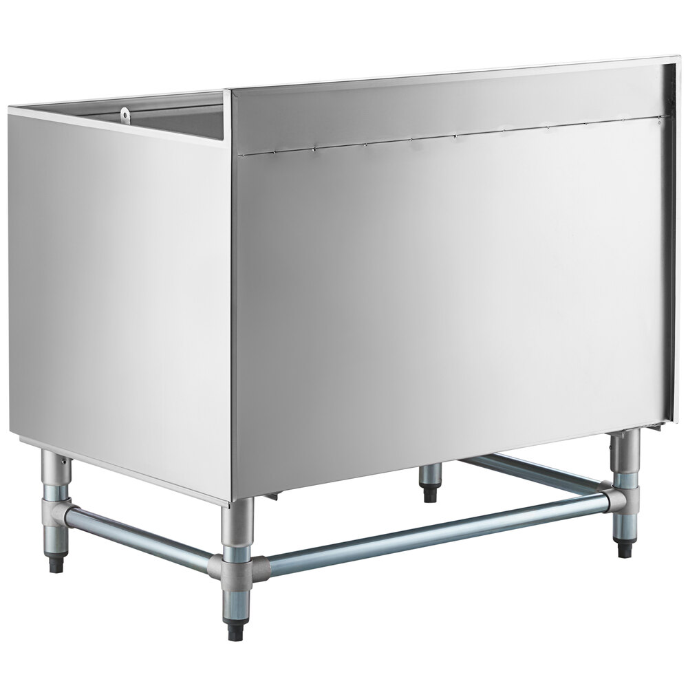 Designed for exceptional durability and long-lasting use at your restaurant or bar, this beer box also has a 3" backsplash to protect the wall and help maintain a sleek, professional appearance. This unit features a mostly stainless steel construction, including an 18 gauge, type 304 stainless steel bowl, top, bottom, backsplash, and apron. It has a 16 gauge type 304 stainless steel perforated false bottom, galvanized steel legs and sockets with U-shape leg bracing, and plastic bullet feet.