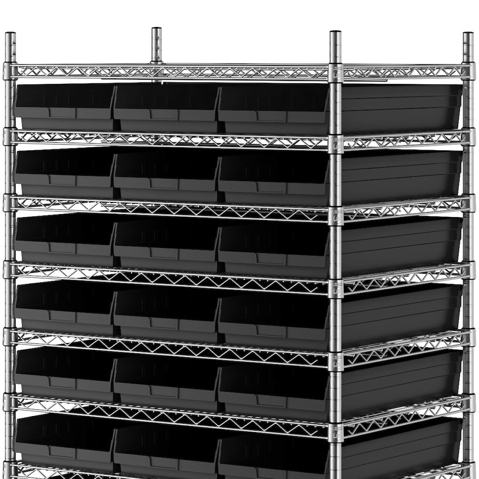 - Includes 12 shelves, 4 posts, and 33 black polypropylene bins