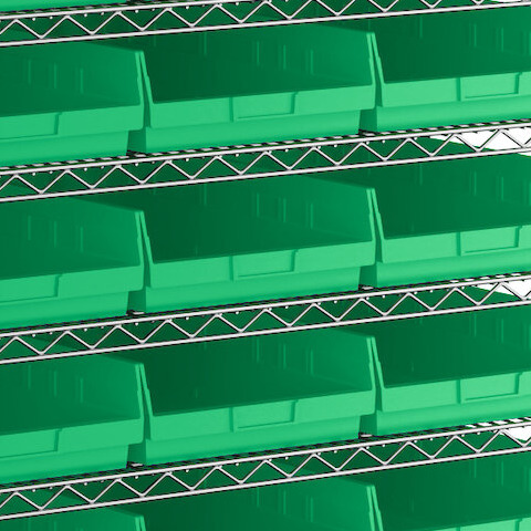 - Includes 12 shelves, 4 posts, and 33 green polypropylene bins