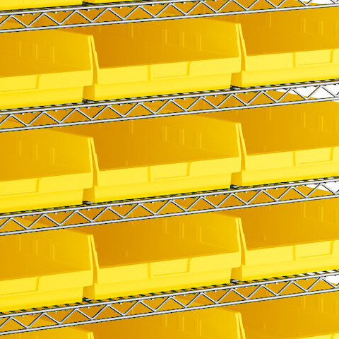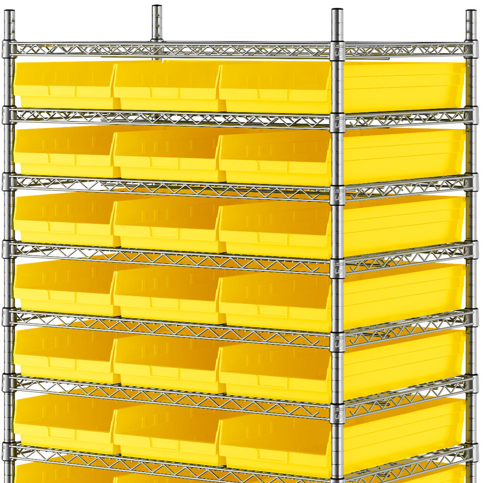 - Includes 12 shelves, 4 posts, and 33 yellow polypropylene bins