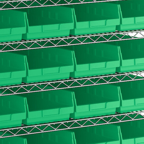 - Includes 12 shelves, 4 posts, and 44 green polypropylene bins