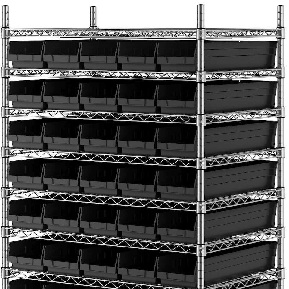 - Includes 12 shelves, 4 posts, and 55 black polypropylene bins
