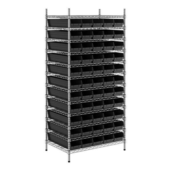 The NSF shelving unit is made of a durable, chrome-plated metal with a clear epoxy coating. It includes 12 shelves, 4 posts, and 55 black injection-molded polypropylene bins, all of which are made to commercial-grade specifications to withstand industrial conditions and for your business's long-lasting use. Each shelf can hold up to an impressive 600 lb. of evenly distributed weight.
