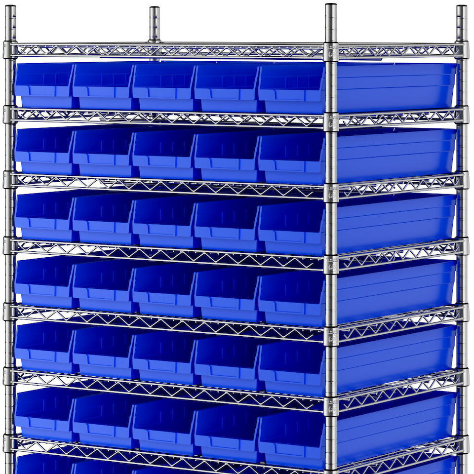 The NSF shelving unit is made of a durable, chrome-plated metal with a clear epoxy coating. It includes 12 shelves, 4 posts, and 55 blue injection-molded polypropylene bins, all of which are made to commercial-grade specifications to withstand industrial conditions and for your business's long-lasting use. Each shelf can hold up to an impressive 600 lb. of evenly distributed weight.
