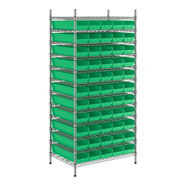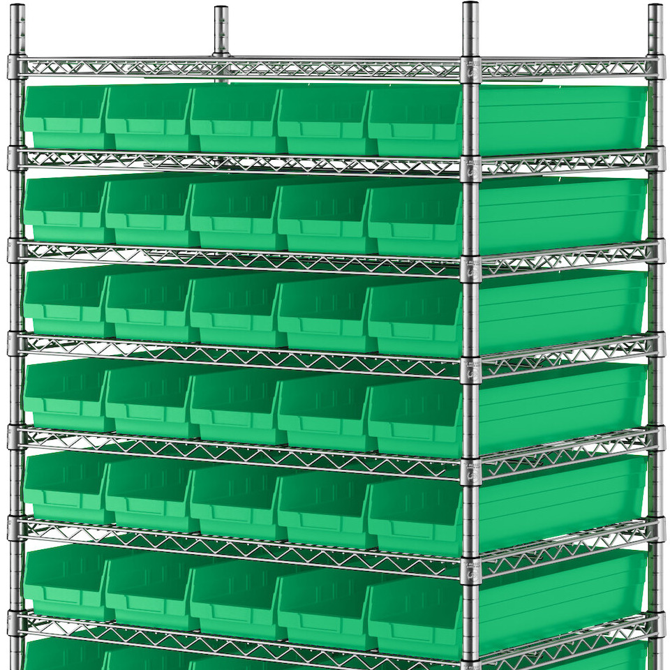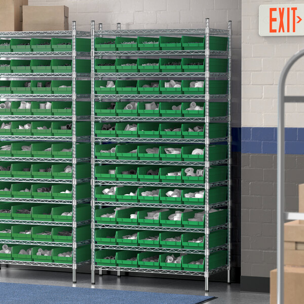 The NSF shelving unit is made of a durable, chrome-plated metal with a clear epoxy coating. It includes 12 shelves, 4 posts, and 55 green injection-molded polypropylene bins, all of which are made to commercial-grade specifications to withstand industrial conditions and for your business's long-lasting use. Each shelf can hold up to an impressive 600 lb. of evenly distributed weight.