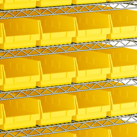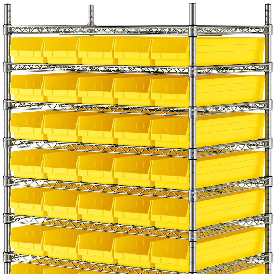 - Includes 12 shelves, 4 posts, and 55 yellow polypropylene bins