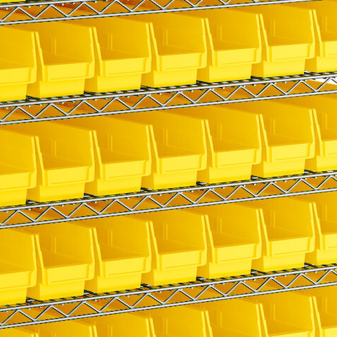 - Includes 12 shelves, 4 posts, and 88 yellow polypropylene bins