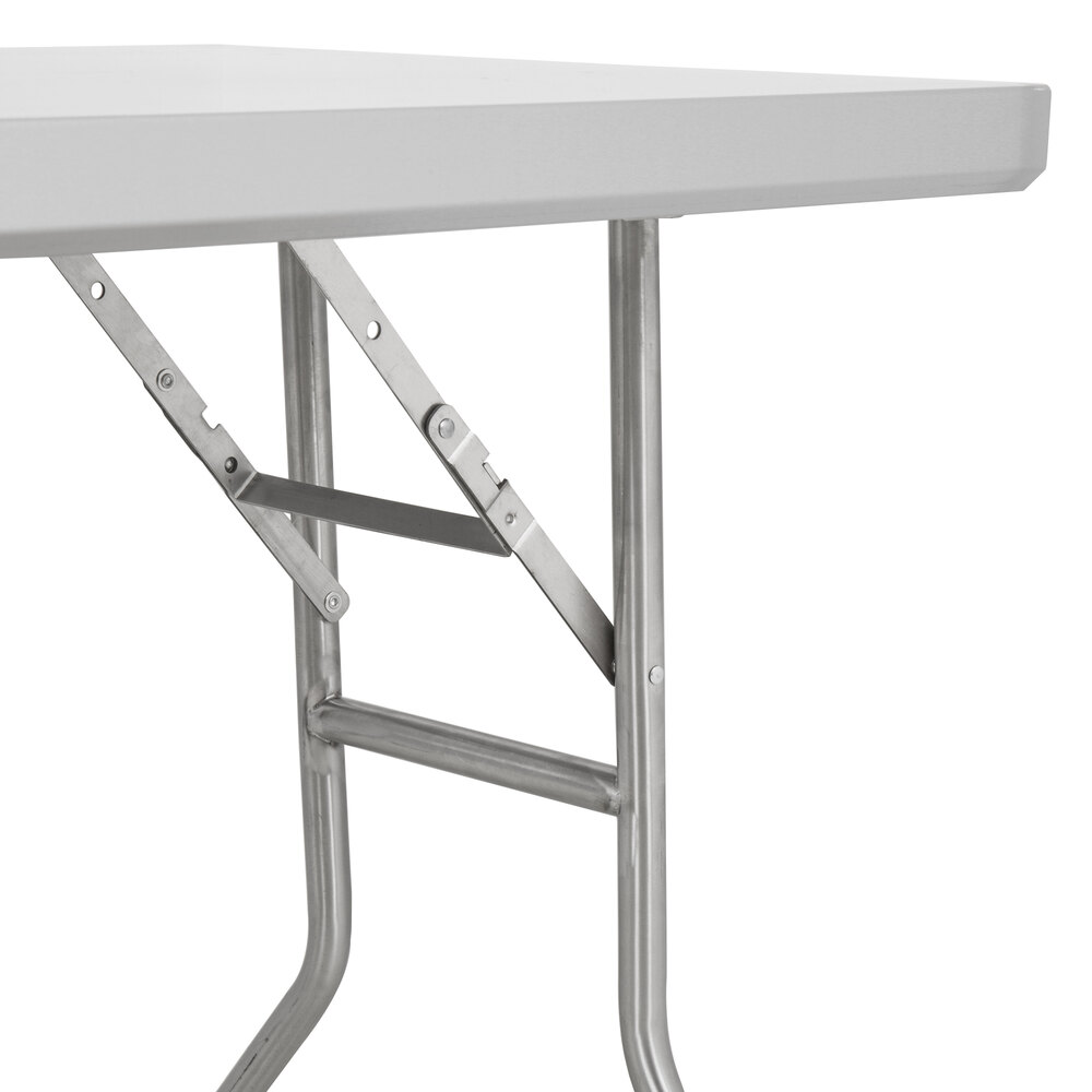 Thanks to its folding design, this work table can easily be transported to remote sites. When it's time for setup, the legs are simply locked into an upright position to give you a sturdy foundation for urns filled with piping hot coffee, chafers full of steaming fresh food, or kettles filled with your signature soups.