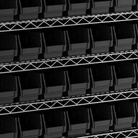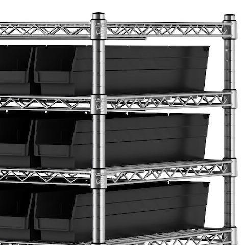 - Includes 12 shelves, 4 posts, and 110 black polypropylene bins