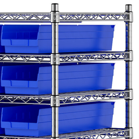 The NSF shelving unit is made of a durable, chrome-plated metal with a clear epoxy coating. It includes 12 shelves, 4 posts, and 66 blue injection-molded polypropylene bins, all of which are made to commercial-grade specifications to withstand industrial conditions and for your business's long-lasting use. Each shelf can hold up to an impressive 600 lb. of evenly distributed weight.