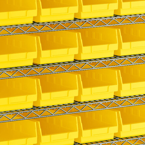 - Includes 12 shelves, 4 posts, and 66 yellow polypropylene bins