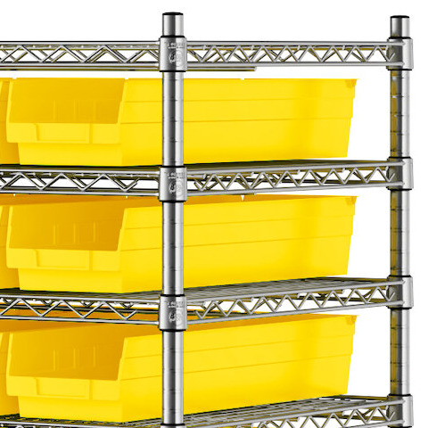 The NSF shelving unit is made of a durable, chrome-plated metal with a clear epoxy coating. It includes 12 shelves, 4 posts, and 66 yellow injection-molded polypropylene bins, all of which are made to commercial-grade specifications to withstand industrial conditions and for your business's long-lasting use. Each shelf can hold up to an impressive 600 lb. of evenly distributed weight.