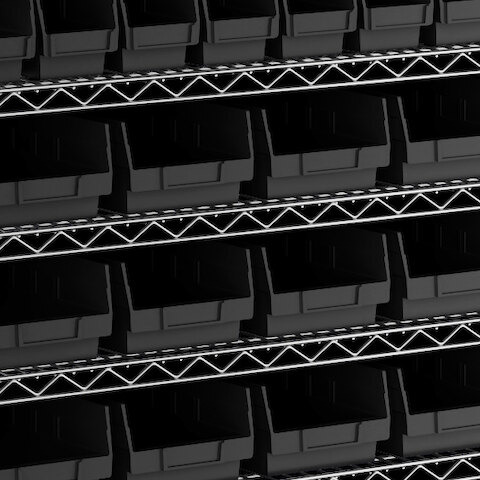 - Includes 12 shelves, 4 posts, and 91 black polypropylene bins