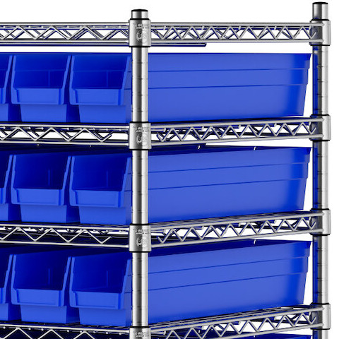The NSF shelving unit is made of a durable, chrome-plated metal with a clear epoxy coating. It includes 12 shelves, 4 posts, and 91 blue injection-molded polypropylene bins, all of which are made to commercial-grade specifications to withstand industrial conditions and for your business's long-lasting use. Each shelf can hold up to an impressive 600 lb. of evenly distributed weight.