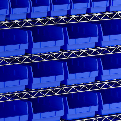 - Includes 12 shelves, 4 posts, and 91 blue polypropylene bins