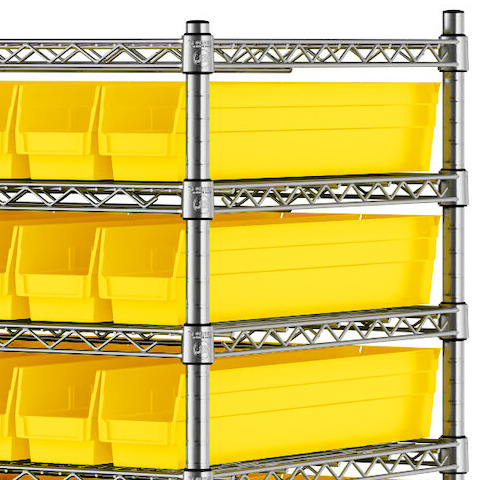 The NSF shelving unit is made of a durable, chrome-plated metal with a clear epoxy coating. It includes 12 shelves, 4 posts, and 91 yellow injection-molded polypropylene bins, all of which are made to commercial-grade specifications to withstand industrial conditions and for your business's long-lasting use. Each shelf can hold up to an impressive 600 lb. of evenly distributed weight.