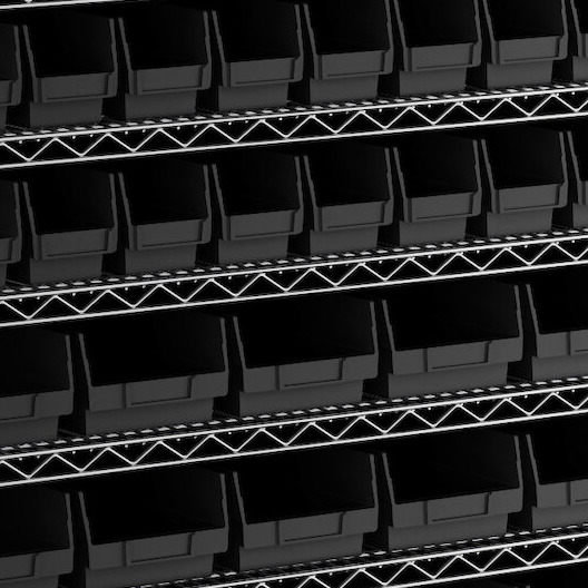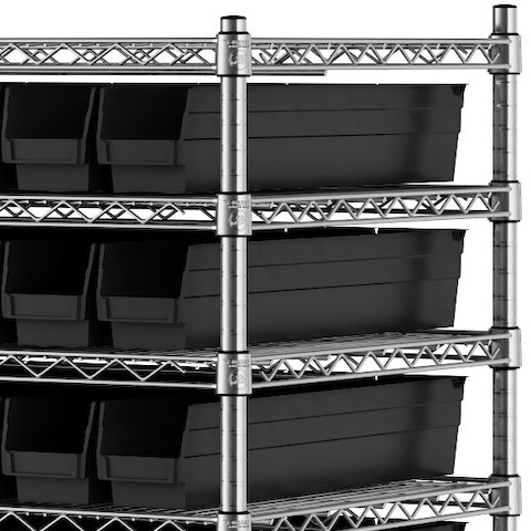 - Includes 12 shelves, 4 posts, and 118 black polypropylene bins