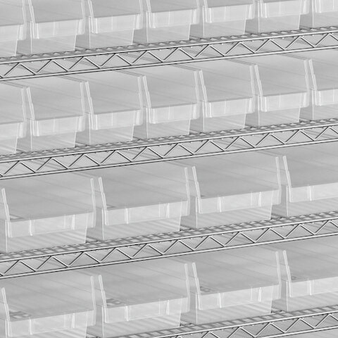 - Includes 12 shelves, 4 posts, and 118 clear polypropylene bins