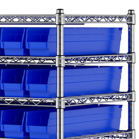 The NSF shelving unit is made of a durable, chrome-plated metal with a clear epoxy coating. It includes 12 shelves, 4 posts, and 143 blue injection-molded polypropylene bins, all of which are made to commercial-grade specifications to withstand industrial conditions and for your business's long-lasting use. Each shelf can hold up to an impressive 450 lb. of evenly distributed weight.
