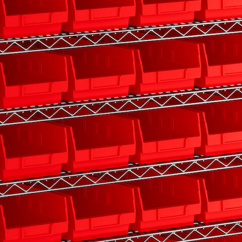 - Includes 12 shelves, 4 posts, and 88 red polypropylene bins