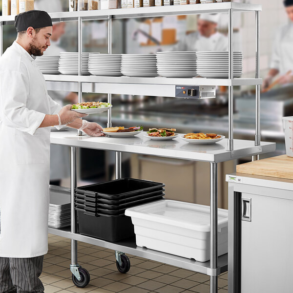 Regency 24" x 96" Expeditor Table with Double Overshelf, Strip Warmer, and 1 Undershelf