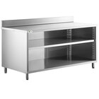 Optimize your commercial workspace with this Regency 30" x 72" 16 gauge type 304 stainless steel enclosed base sliding door table with adjustable midshelf and 6" backsplash.