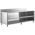 Optimize your commercial workspace with this Regency 30" x 96" 16 gauge type 304 stainless steel enclosed base open front table with adjustable midshelf and 6" backsplash.