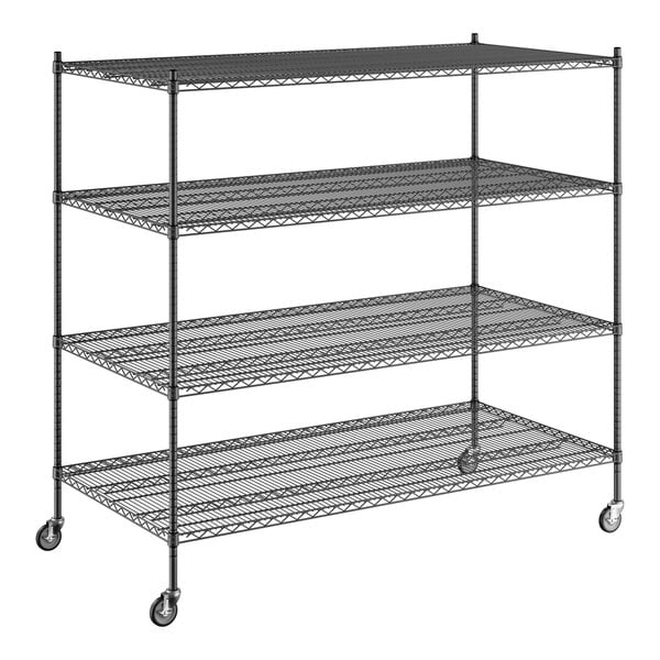 View All ItemsKeep your storage area organized with this Regency NSF black epoxy mobile wire shelving starter kit with 4 shelves!