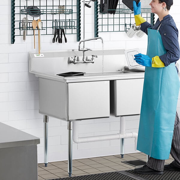 Outfit your facility with a long-lasting sink that will meet your needs with this Regency 43" stainless steel two compartment commercial sink. This durable sink is made with high-quality, welded 16 gauge type 304 stainless steel for durability, corrosion resistance, and long-lasting use. It's dipped a minimum of 1/4" to facilitate better drainage, and it also features 1 5/8" diameter galvanized steel legs with adjustable plastic bullet feet that provide added stability.