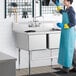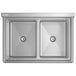 This sink features (2) 14" deep bowls that includes a 3 1/2" drain basket strainer to catch food debris, which prevents the drain from clogging. It also features a 1 1/2" drain outlet size. For easy cleaning, the compartment has rounded corners so you can rinse and wipe down the sink. This sink also includes a 1 1/2" raised, rolled edge that raises to 2" on the front and both sides, as well as a 9 3/4" tall backsplash to contain splashes and overflow. The sink is designed with (2) 1 1/8" diameter holes punched on 8" centers to accommodate 1 faucet (sold separately).