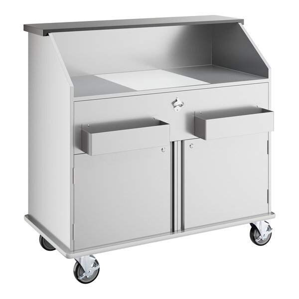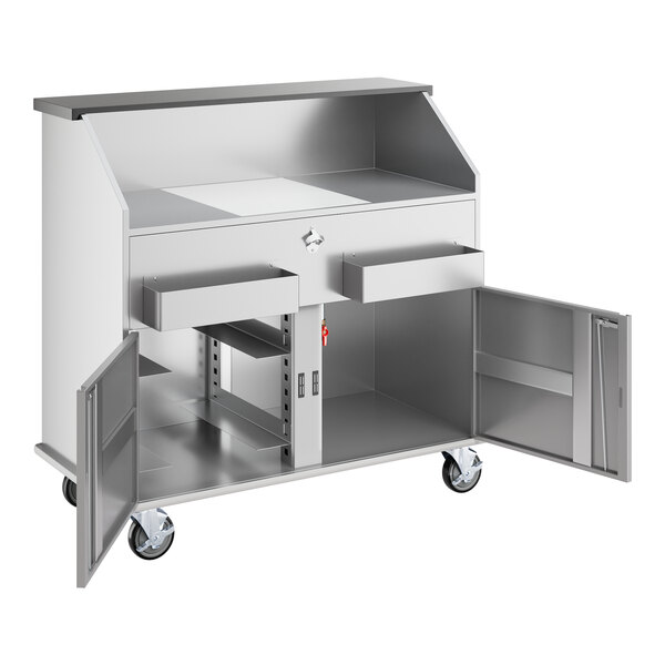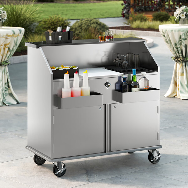 Designed for easy drink preparation and serving, this portable bar comes with dual surfaces for creating delicious drinks as well as presenting those creations to customers. This portable bar will make beverage service in your banquet hall, hotel lobby, outdoor wedding reception, or poolside terrace a breeze!