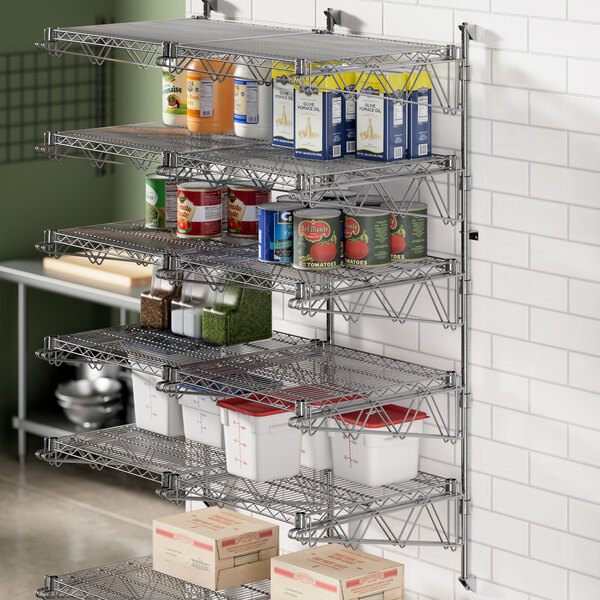 Make the most of your storage space with this Regency 5-level chrome wall-mount middle shelf post with double brackets for 24" deep shelves.