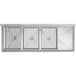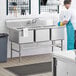 This sink features (3) 14" deep bowls that each include (1) 3 1/2" drain basket strainer to catch food debris, which prevents the drain from clogging, and a 1 1/2" IPS drain connection. For easy cleaning, the compartments have rounded corners so you can rinse and wipe down the sink. This sink also includes a 1 1/2" raised, rolled edge that raises to 2" on the front and both sides, as well as a 9 3/4" tall backsplash to contain splashes and overflow. The sink is designed with (2) 1 1/8" diameter holes punched on 8" centers to accommodate 1 faucet (sold separately).