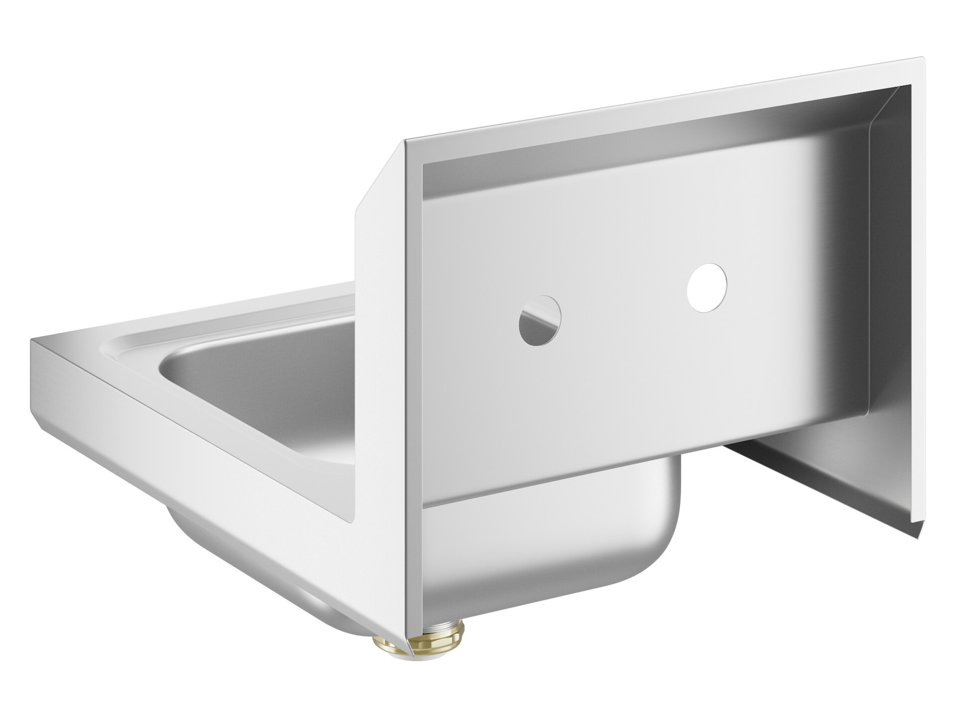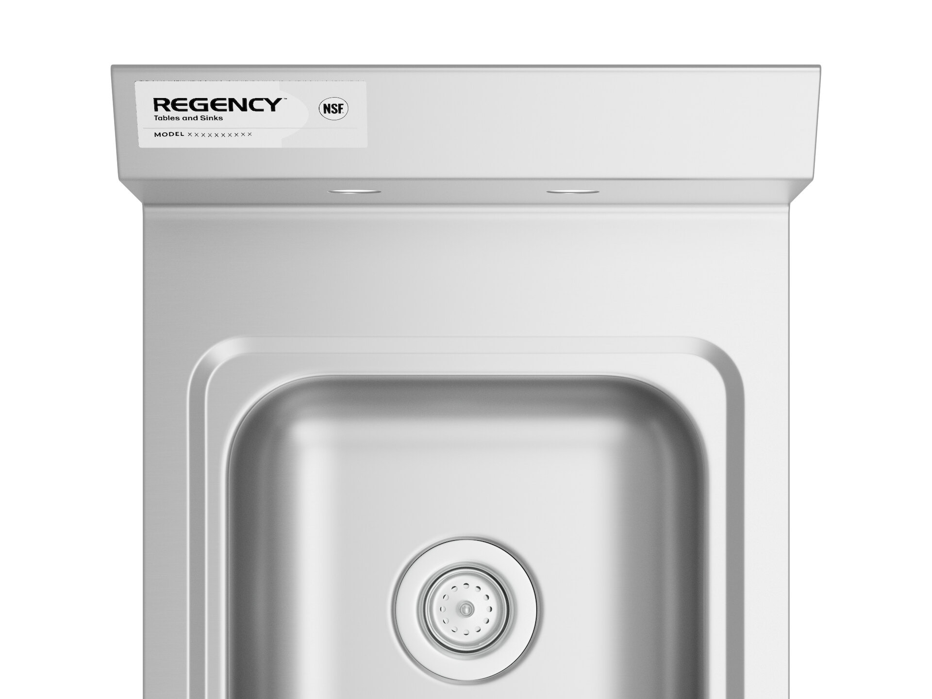 This hand sink includes a strainer and has two holes punched on 4" centers for a wall-mounted faucet (sold separately).