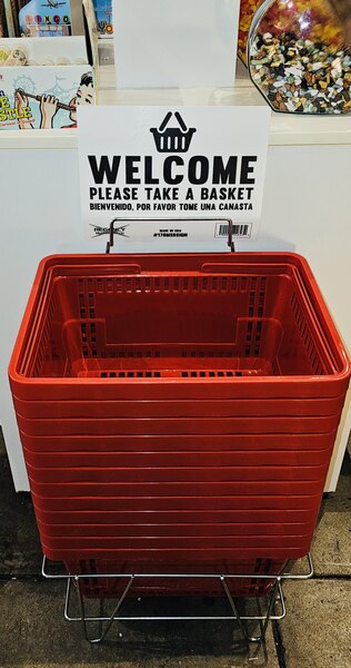 For a central spot to keep your baskets, a stand is included that can hold up to 12 baskets. It is made of durable iron for a piece that is built to last whether placed inside or outside of your business. The slot at the top of the stand is perfect to place the included sign to promote customers to grab a basket while they shop. Written in both English and Spanish, the sign will appeal to a larger pool of shoppers.