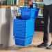 Constructed of durable plastic, the baskets are both resilient as well as lightweight. The handles are wide and flat for more even distribution of weight, as opposed to thin round handles that can be uncomfortable to carry. The design of the basket does not allow for any water build-up, making it capable of being kept outside of your establishment as well as inside, without worry of water being tracked inside. For added convenience, the smooth plastic construction is also easy to clean and maintain.