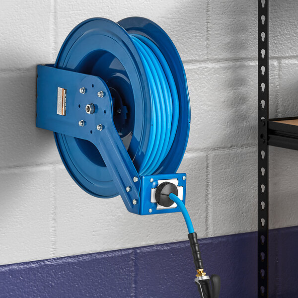 Equip your business with the Regency blue powder-coated steel open hose reel with a 75' hose!